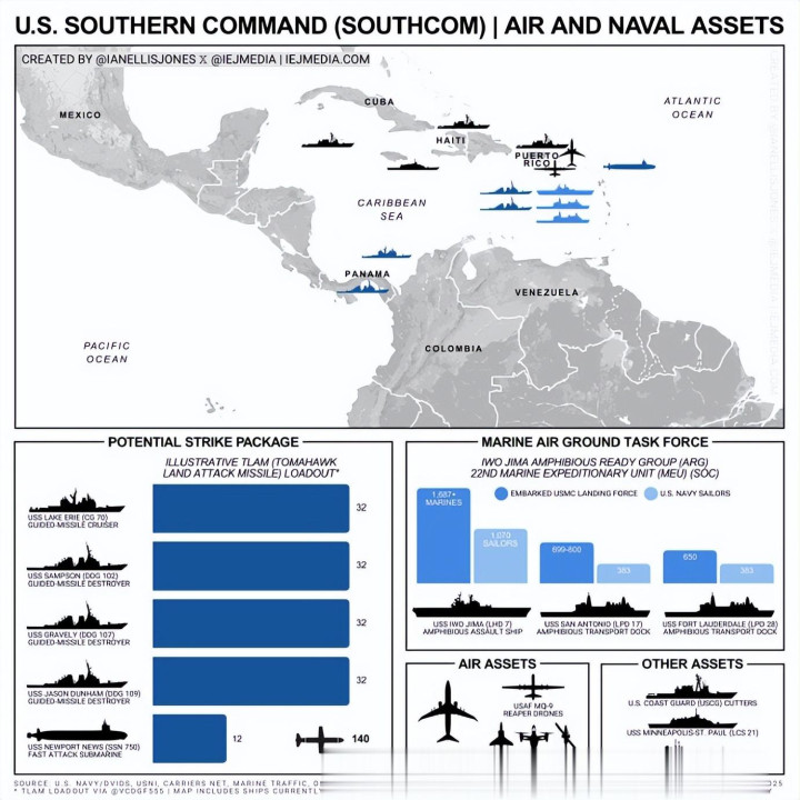 截至目前,美国海军及海岸警卫队在委内瑞拉周边海域部署的大型舰艇已经达到15艘,其中“硫磺岛”号两栖舰群载有约2200名陆战队员。