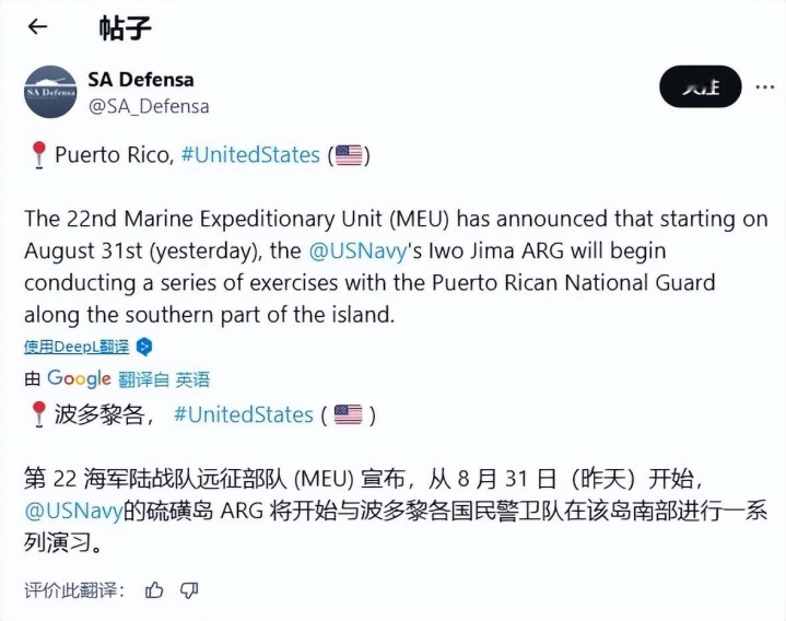 另外,据美国海军陆战队第22远征部队发布的通报,从8月31日起,“硫磺岛”号两栖打击舰群将在波多黎各岛南部开展演习——波多黎各岛位于委内瑞拉北部,因此美军等同于是在委内瑞拉“家门口”举行军演。